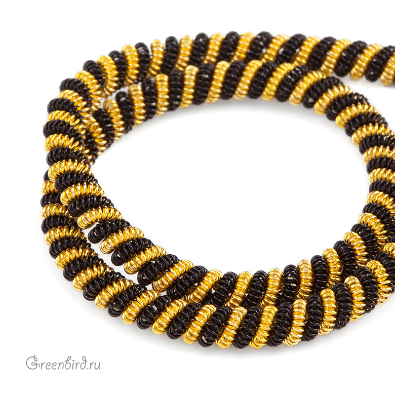 Канитель двойной жгут — металлическая нить для вышивания (медь), представляет собой пружинку, закрученную в спираль. Диаметр: 4 мм, цвет: черный/золото. Производство: Индия. Цена указана за 5 грамм (примерно 20 см). Из-за особенностей материала непрерывность нити в упаковке не гарантируется, вы получите несколько отрезков разной длины.