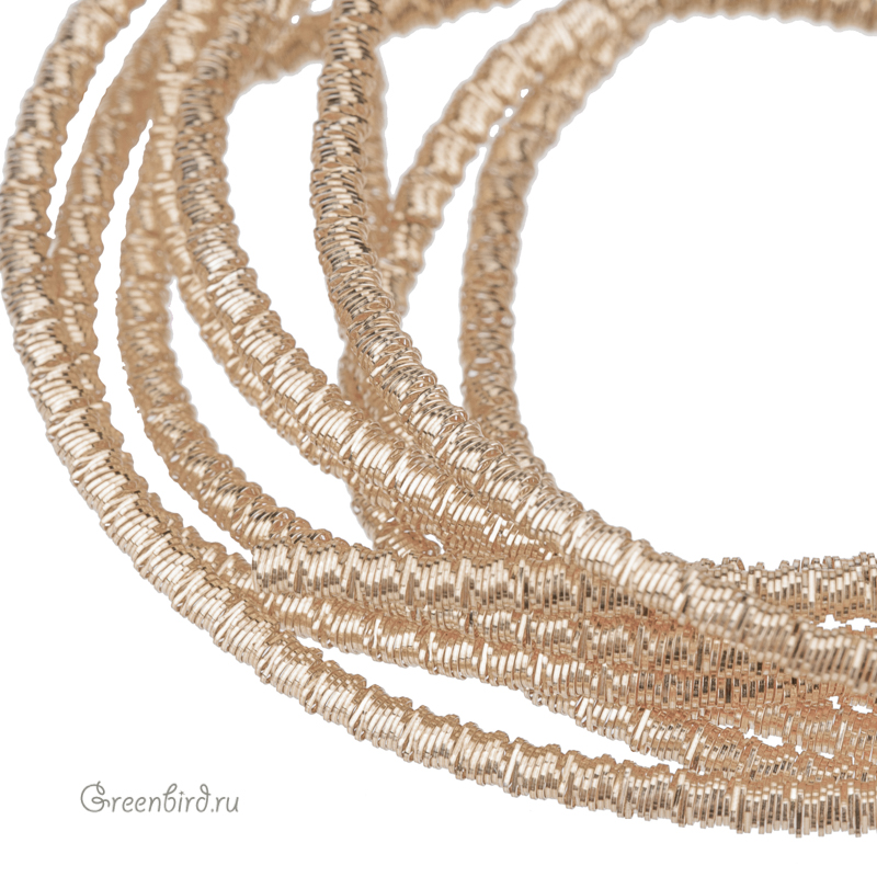 Канитель фигурная "Волна" — металлическая нить для вышивания (медь), закрученная в спираль с двойным паттерном. Диаметр: 1,7 мм, цвет: бледное золото. Производство: Индия. Цена указана за 5 грамм (примерно 1,7 метра). Из-за особенностей материала непрерывность нити в упаковке не гарантируется, вы получите несколько отрезков разной длины.