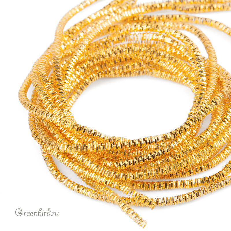 Канитель трунцал — металлическая граненая нить для вышивания из проволоки плоского сечения (медь), закрученная в спираль пятиугольной формы. Диаметр: 2 мм, цвет: яркое золото. Производство: Индия. Цена указана за 5 грамм (примерно 2 метра). Из-за особенностей материала непрерывность нити в упаковке не гарантируется, вы получите несколько отрезков разной длины.