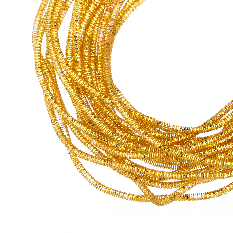Канитель трунцал — металлическая граненая нить для вышивания из проволоки плоского сечения (медь), закрученная в спираль пятиугольной формы. Диаметр: 1,2 мм, цвет: медовое золото. Производство: Индия. Цена указана за 5 грамм (примерно 3,5 метра). Из-за особенностей материала непрерывность нити в упаковке не гарантируется, вы получите несколько отрезков разной длины.