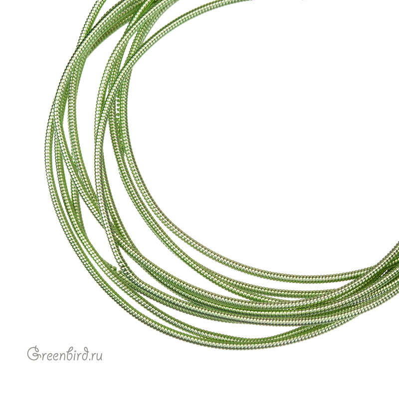 Канитель жесткая — металлическая нить для вышивания (медь), закрученная в спираль. Диаметр: 1 мм, цвет: салатовый. Производство: Индия. Цена указана за 5 грамм (примерно 1,15 метра). Из-за особенностей материала непрерывность нити в упаковке не гарантируется, вы получите несколько отрезков разной длины.