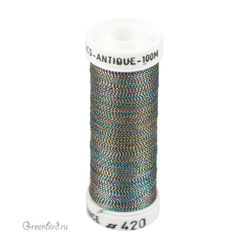 Тонкая металлизированная нить Au Ver à Soie Antique для вышивки и ручной работы. Цвет: #420 (меланж, золото/бирюзовый/бледно-розовый/черный). Состав: 35% полиэстер, 65% купро (тонкая шелковая вискоза). Производство: Франция. Цена указана за 1 шт. (100 метров).