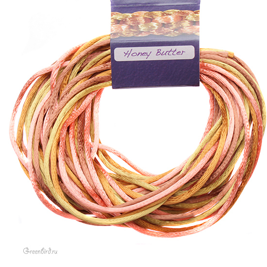 Сатиновый шнур для работы в японской технике кумихимо. Толщина: 2 мм, длина: 3 ярда (около 2,7 метров). Цвет: Микс Honey Butter (античное золото, верблюд, персик, светло-коричневый). Производство: США. Цена указана за упаковку (4 шнура).