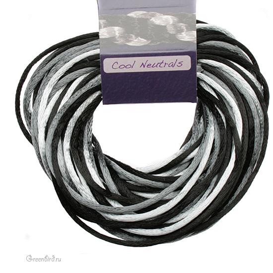 Сатиновый шнур для работы в японской технике кумихимо. Толщина: 1 мм, длина: 3 ярда (около 2,7 метров). Цвет: Микс Cool Neutrals (черный, темно-серый, серебро). Производство: США. Цена указана за упаковку (4 шнура).