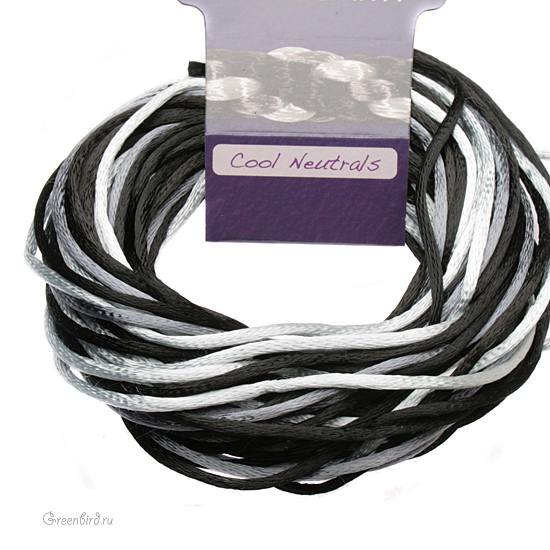 Сатиновый шнур для работы в японской технике кумихимо. Толщина: 2 мм, длина: 3 ярда (около 2,7 метров). Цвет: Микс Cool Neutrals (черный, темно-серый, серебро). Производство: США. Цена указана за упаковку (4 шнура).
