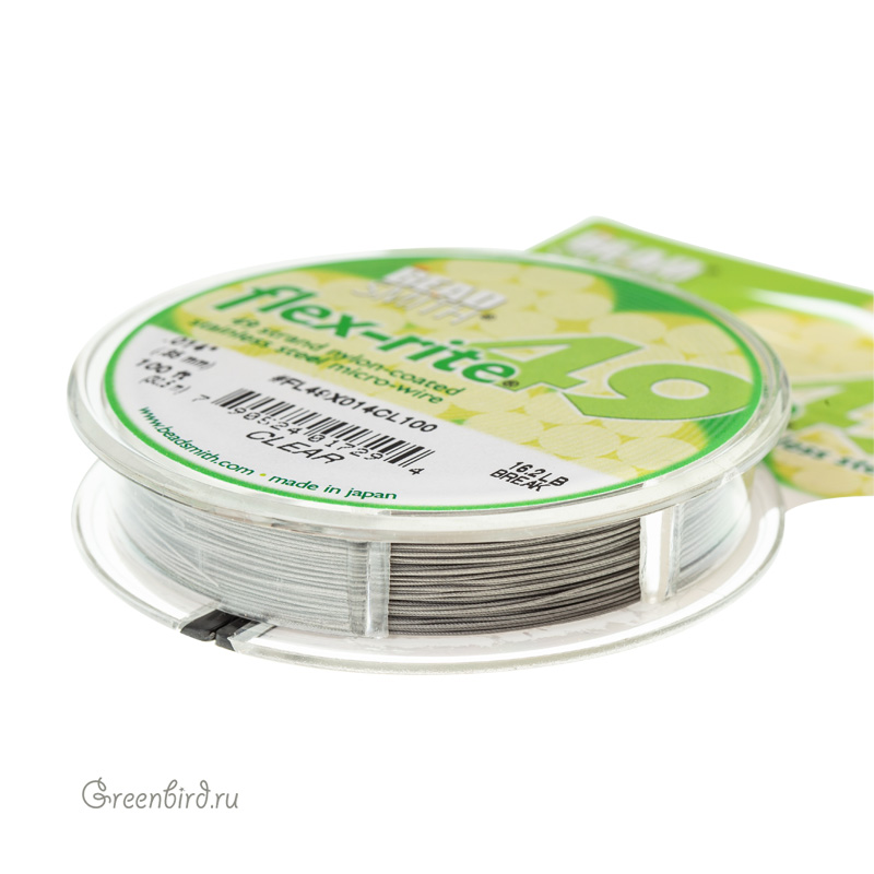 Ювелирный тросик Flex-Rite 49 (49 стальных струн) тонкий с нейлоновым покрытием. Диаметр: 0,35 мм, цвет: серебристо-серый (стальной тросик с прозрачным покрытием). Выдерживает вес до 5,8 кг. Производство: Япония. Цена указана за 1 катушку 100 футов (30,5 м).