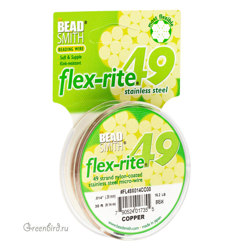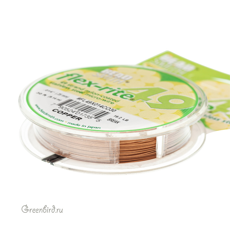 Ювелирный тросик Flex-Rite 49 (49 стальных струн) тонкий с нейлоновым покрытием. Диаметр: 0,35 мм, цвет: медь. Выдерживает вес до 7,3 кг. Производство: Япония. Цена указана за 1 катушку 30 футов (9,14 м).