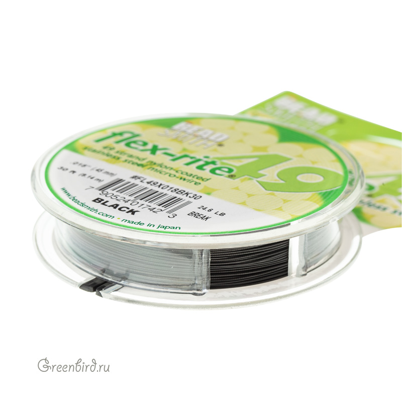 Ювелирный тросик Flex-Rite 49 (49 стальных струн) с нейлоновым покрытием. Диаметр: 0,45 мм, цвет: черный. Выдерживает вес до 11 кг. Производство: Япония. Цена указана за 1 катушку 30 футов (9,14 м).