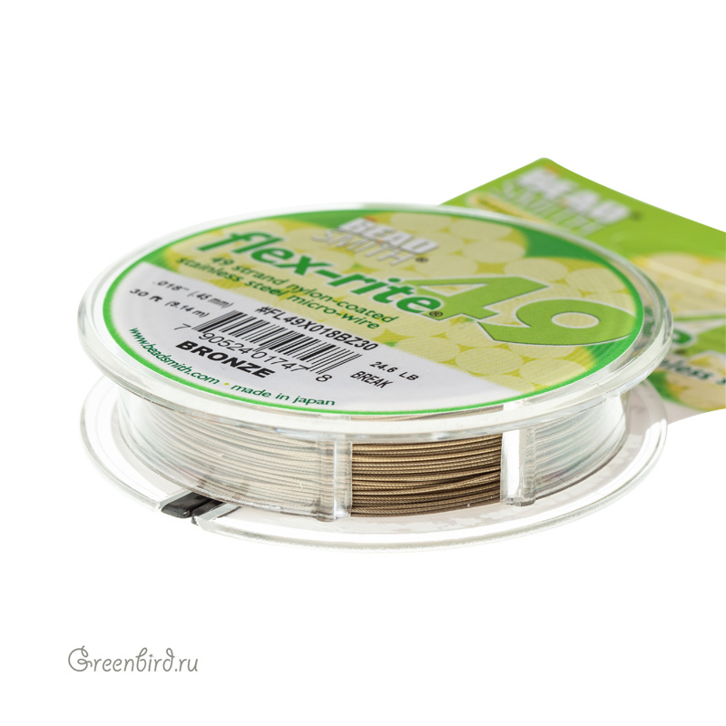 Ювелирный тросик Flex-Rite 49 (49 стальных струн) с нейлоновым покрытием. Диаметр: 0,45 мм, цвет: бронза. Выдерживает вес до 11 кг. Производство: Япония. Цена указана за 1 катушку 30 футов (9,14 м).