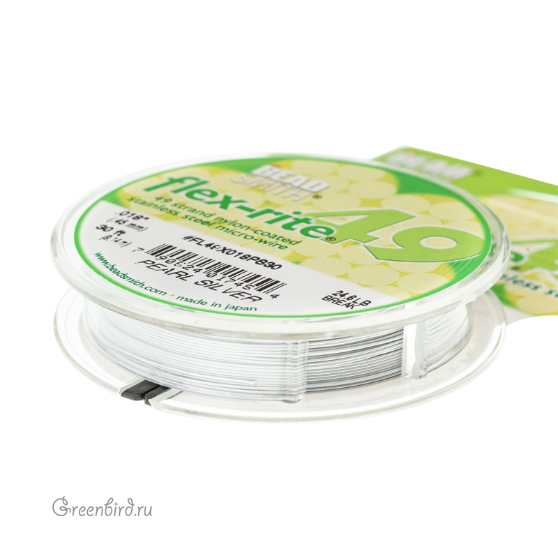 Ювелирный тросик Flex-Rite 49 (49 стальных струн) с нейлоновым покрытием. Диаметр: 0,45 мм, цвет: жемчужно-серебристый. Выдерживает вес до 11 кг. Производство: Япония. Цена указана за 1 катушку 30 футов (9,14 м).