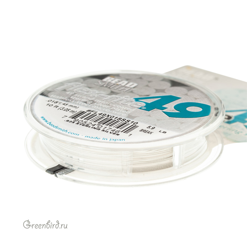 Ювелирный тросик Flex-Rite 49 (49 стальных струн) с нейлоновым покрытием. Диаметр: 0,45 мм, дополнительное покрытие: серебро (sterling silver), цвет: жемчужный. Выдерживает вес до 2,6 кг. Производство: Япония. Цена указана за 1 катушку 10 футов (3,05 м).