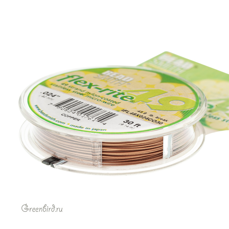 Ювелирный тросик Flex-Rite 49 (49 стальных струн) толстый с нейлоновым покрытием. Диаметр: 0,6 мм, цвет: медь. Выдерживает вес до 19,8 кг. Производство: Япония. Цена указана за 1 катушку 30 футов (9,14 м).