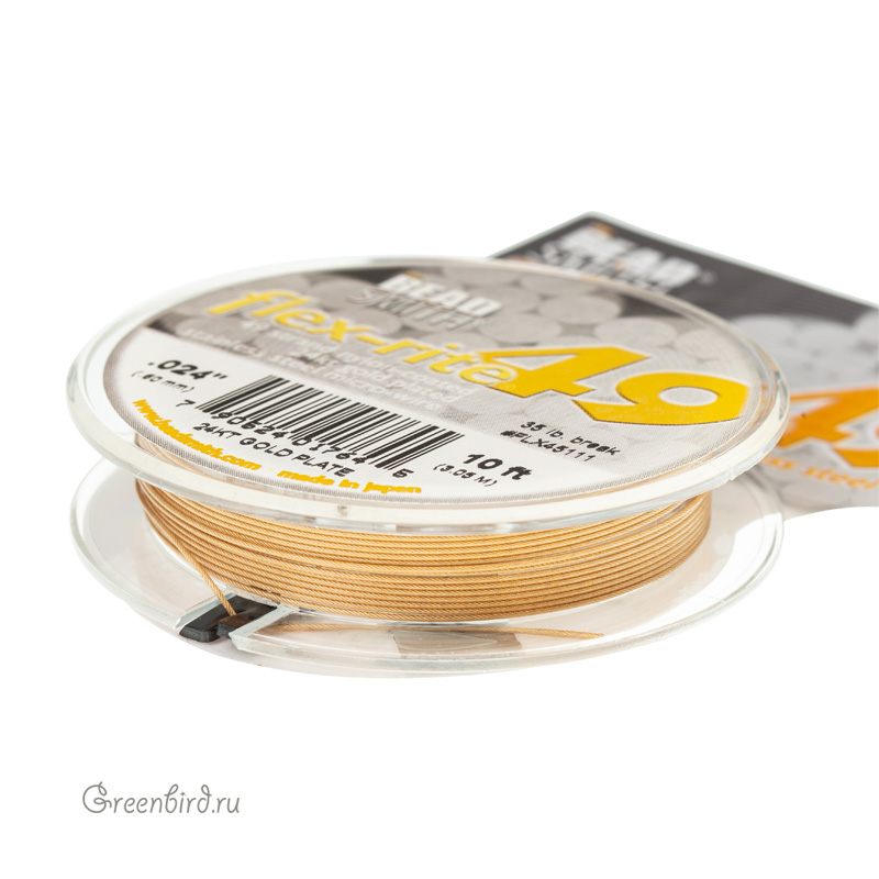 Ювелирный тросик Flex-Rite 49 (49 стальных струн) толстый с нейлоновым покрытием. Диаметр: 0,6 мм, дополнительное покрытие: золото 24 карат (24Kt Gold Plate), цвет: античное золото. Выдерживает вес до 15,8 кг. Производство: Япония. Цена указана за 1 катушку 10 футов (3,05 м).