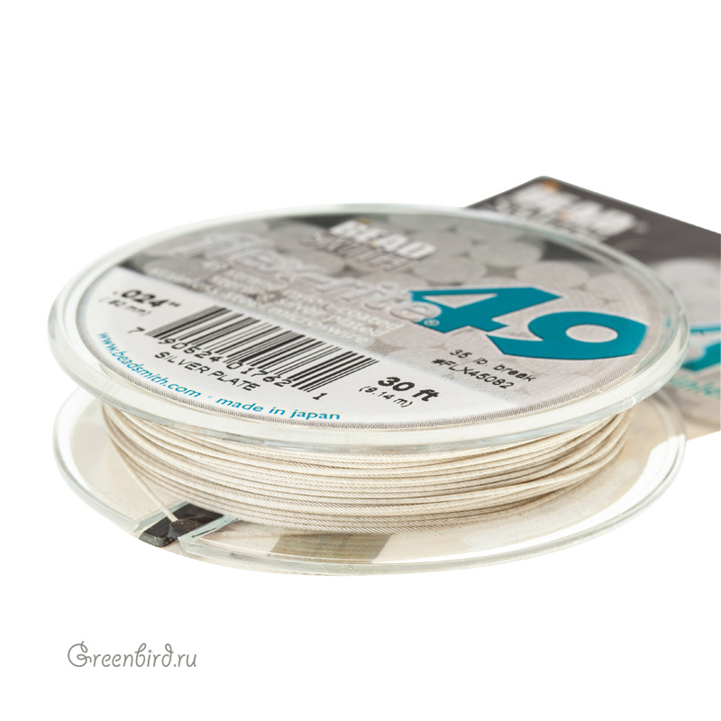 Ювелирный тросик Flex-Rite 49 (49 стальных струн) толстый с нейлоновым покрытием. Диаметр: 0,6 мм, дополнительное покрытие: серебро (sterling silver), цвет: жемчужный. Выдерживает вес до 15,8 кг. Производство: Япония. Цена указана за 1 катушку 30 футов (9,14 м).