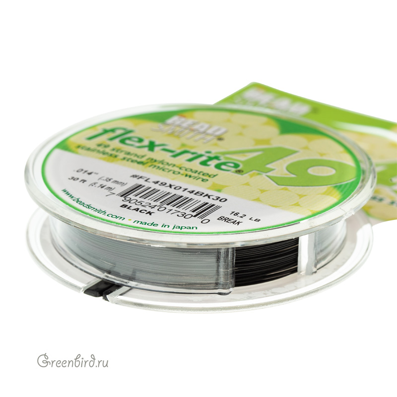 Ювелирный тросик Flex-Rite 49 (49 стальных струн) тонкий с нейлоновым покрытием. Диаметр: 0,35 мм, цвет: черный. Выдерживает вес до 5,8 кг. Производство: Япония. Цена указана за 1 катушку 30 футов (9,14 м).