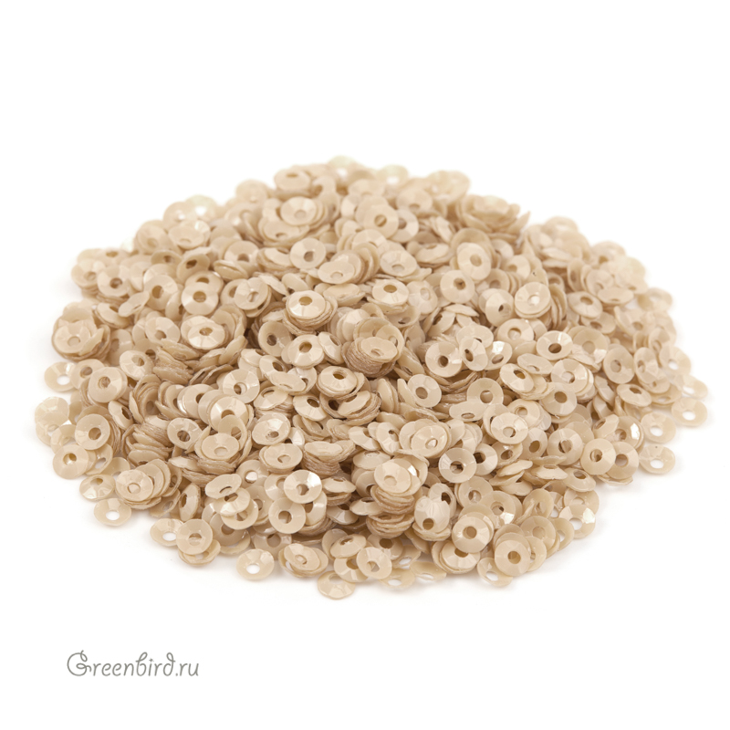 Пайетки чаша (100% полиэстер), используются в декоративной вышивке. Цвет: песок, эффект: Opaline, размер: 3 мм. Производство: Италия. Цена указана за 3 грамма (примерно 1700 штук).