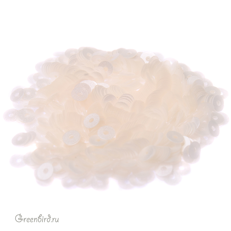 Пайетки плоские (100% полиэстер), используются в декоративной вышивке. Цвет: белый, эффект Perliane; размер: 3 мм. Производство: Франция. Цена указана за нить 1000 штук (примерно 1,5 грамма).