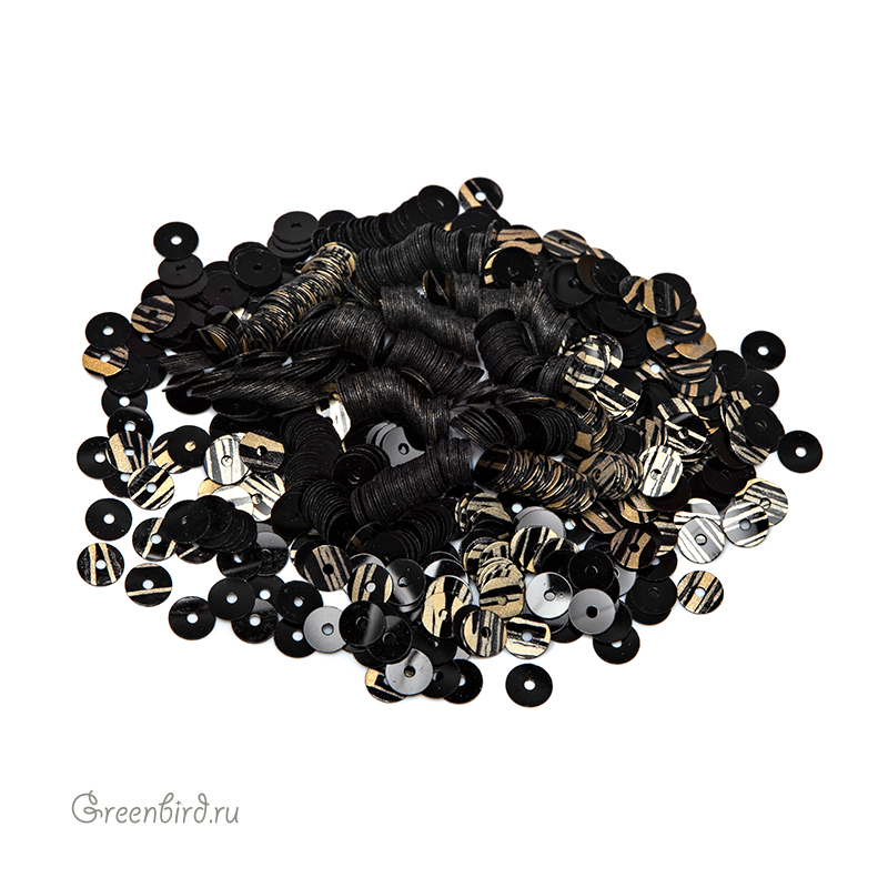 Пайетки плоские (100% полиэстер), используются в декоративной вышивке. Цвет: черный Ренессанс, эффект Marbre, размер: 4 мм. Производство: Франция. Цена указана за нить 1000 штук (примерно 2,8 грамма).