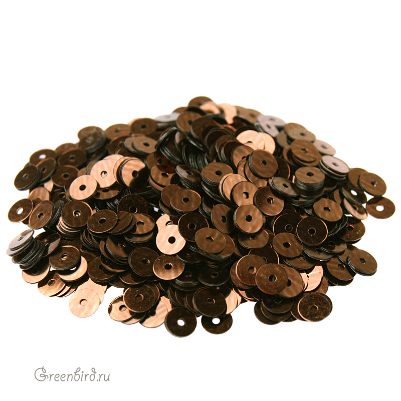 Пайетки плоские (100% полиэстер), используются в декоративной вышивке. Цвет: темная бронза, размер: 4 мм. Производство: Франция. Цена указана за нить 1000 штук (примерно 2,8 грамма).
