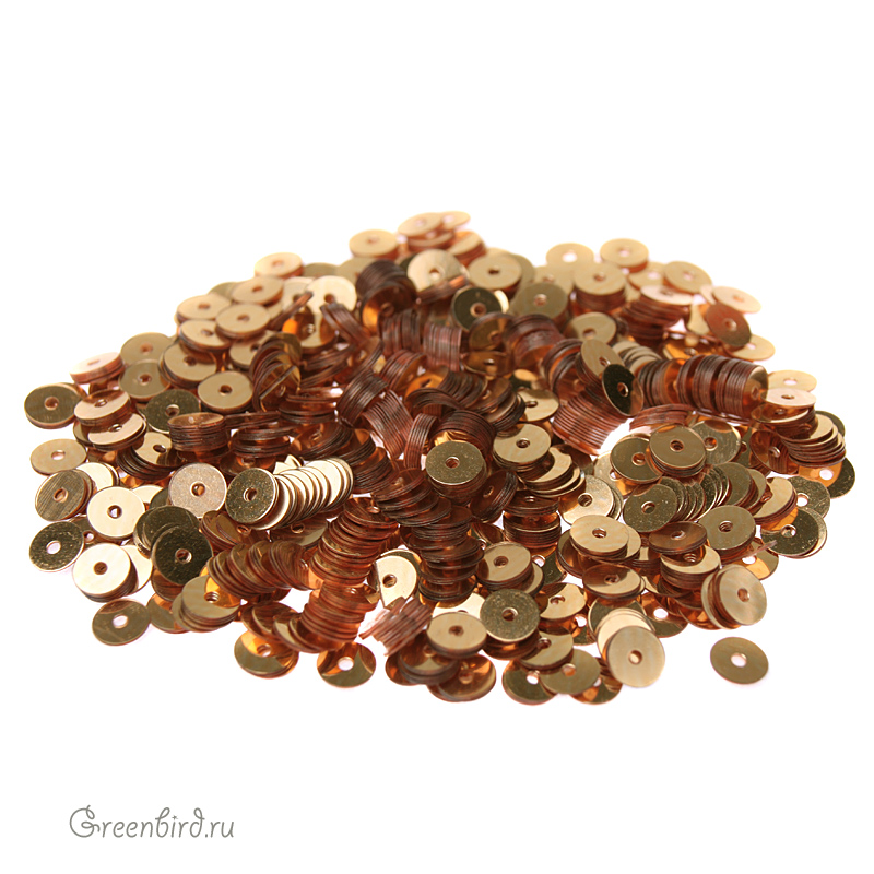 Пайетки плоские (100% полиэстер), используются в декоративной вышивке. Цвет: золото, размер: 4 мм. Производство: Франция. Цена указана за нить 1000 штук (примерно 2,8 грамма).