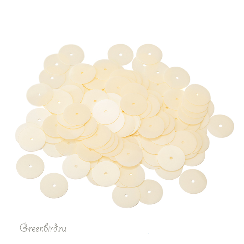 Пайетки плоские (100% полиэстер), используются в декоративной вышивке. Цвет: слоновая кость, эффект Opaline, размер: 10 мм. Производство: Италия. Цена указана за 3 грамма (примерно 156 штук).