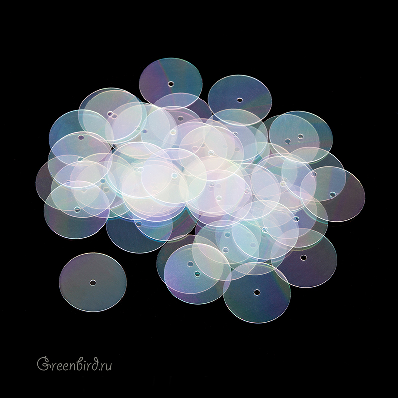 Пайетки плоские (100% полиэстер), используются в декоративной вышивке. Цвет: прозрачный, радужный, эффект: Irise Trasparenti, размер: 16 мм. Производство: Италия. Цена указана за 3 грамма (примерно 58 штук).