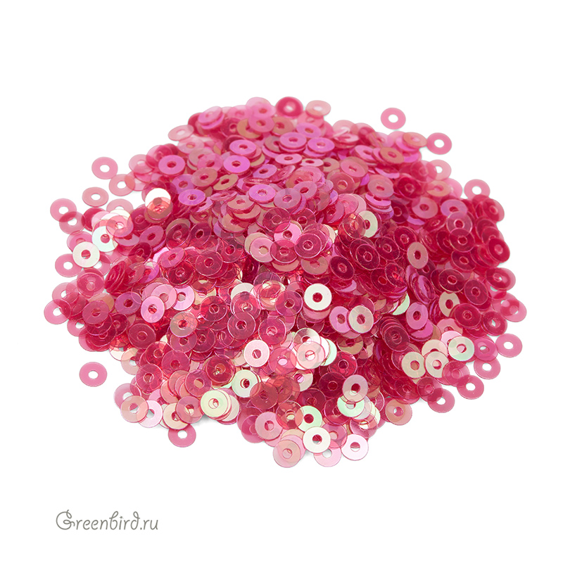 Пайетки плоские (100% полиэстер), используются в декоративной вышивке. Цвет: фуксия, эффект Irise Trasparenti, размер: 3 мм. Уход: бережная стирка 30°, не отбеливать, гладить на единичке (120°), не сушить в барабане машинки, сухая чистка ℗. Производство: Италия. Цена указана за 3 грамма (примерно 1800 штук).