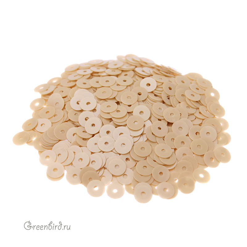 Пайетки плоские (100% полиэстер), используются в декоративной вышивке. Цвет: песок, эффект: Opaline, размер: 4 мм. Уход: бережная стирка 30°, не отбеливать, гладить на единичке (120°), не сушить в барабане машинки, сухая чистка ℗. Производство: Италия. Цена указана за 3 грамма (примерно 1000 штук).