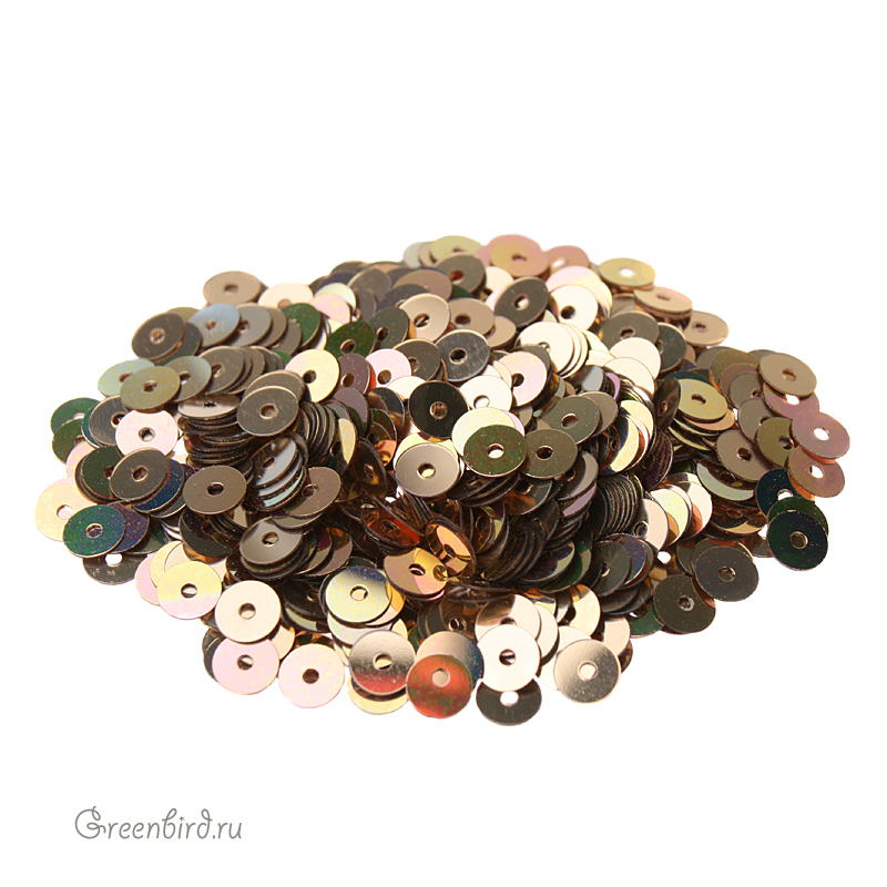 Пайетки плоские (100% полиэстер), используются в декоративной вышивке. Цвет: светло-коричневый, эффект Irise Metallizzati, размер: 4 мм. Уход: не стирать, не отбеливать, гладить на единичке (120°), не сушить в барабане машинки, сухая чистка ℗. Производство: Италия. Цена указана за 3 грамма (примерно 1000 штук).