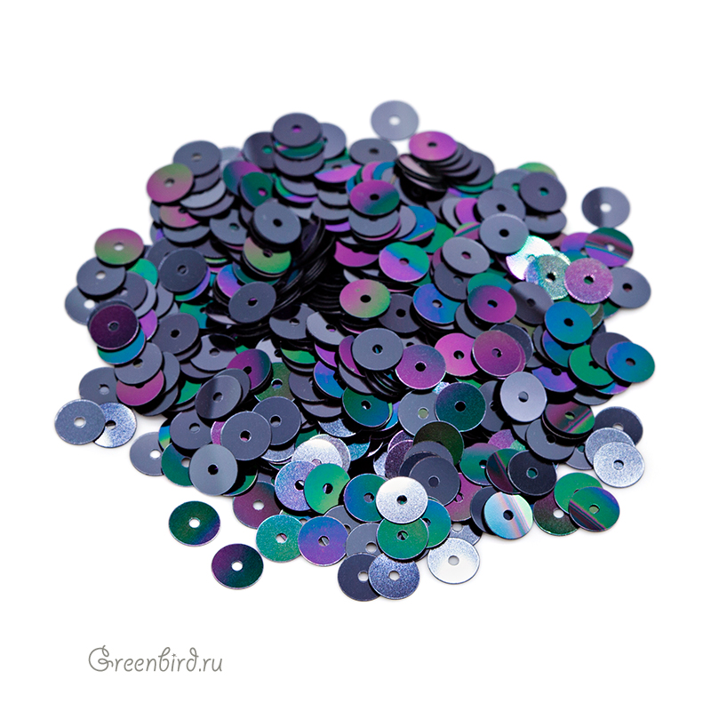 Пайетки плоские (100% полиэстер), используются в декоративной вышивке. Цвет: черный ирис, эффект Irise Metallizzati, размер: 5 мм. Производство: Италия. Цена указана за 3 грамма (примерно 645 штук).