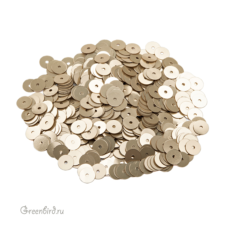 Пайетки плоские (100% полиэстер), используются в декоративной вышивке. Цвет: золото, эффект Metal, размер: 5 мм. Производство: Италия. Цена указана за 3 грамма (примерно 645 штук).