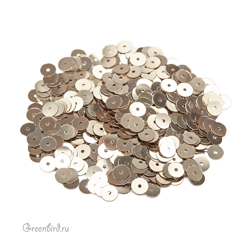Пайетки плоские (100% полиэстер), используются в декоративной вышивке. Цвет: светлое золото, эффект: Metallizzati, размер: 5 мм. Производство: Италия. Цена указана за 3 грамма (примерно 645 штук).