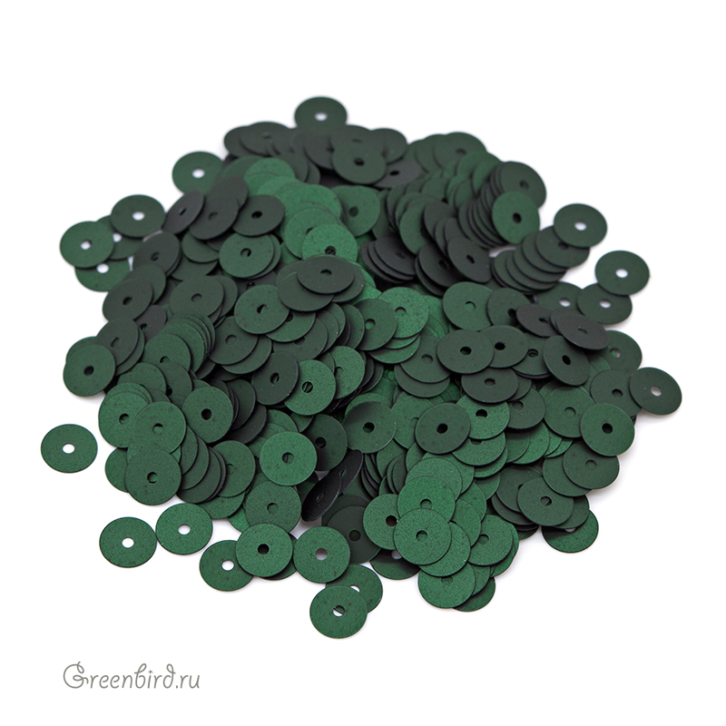 Пайетки плоские (100% полиэстер), используются в декоративной вышивке. Цвет: темно-зеленый, эффект Satinati MT, размер: 5 мм. Производство: Италия. Цена указана за 3 грамма (примерно 645 штук).