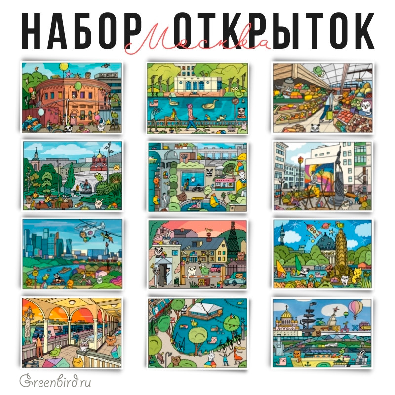 Коллекционные открытки от Greenbird с авторскими рисунками, серия "Москва". В набор входит 12 глянцевых открыток с различными изображениями знаковых мест Москвы (при участии Зеленой Птички и её друзей – сборщиков). Оборотная сторона матовая, оформлена в виде почтовой открытки. Подходит для подписей от руки и наклеивания стикеров. Размер каждой открытки: 14,8 х 10,5 см (может незначительно отличаться из-за особенностей производства). Стоимость указана за 1 набор.