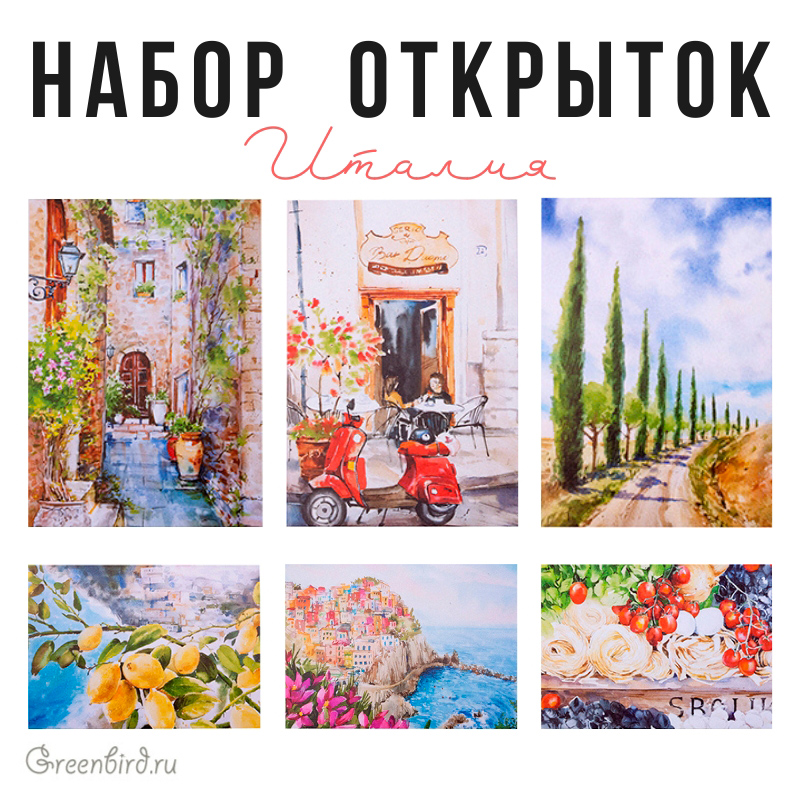 Коллекционные открытки от Greenbird с авторскими рисунками. В набор входит 6 перламутрово-глянцевых открыток, посвященных Летнему Конкурсу Greenbird.ru 2019 на тему "Италия". Оборотная сторона оформлена в виде почтовой открытки. Подходит для подписей от руки и наклеивания стикеров. Размер каждой открытки: 14,8 х 10,5 см (может незначительно отличаться из-за особенностей производства). Стоимость указана за 1 набор.